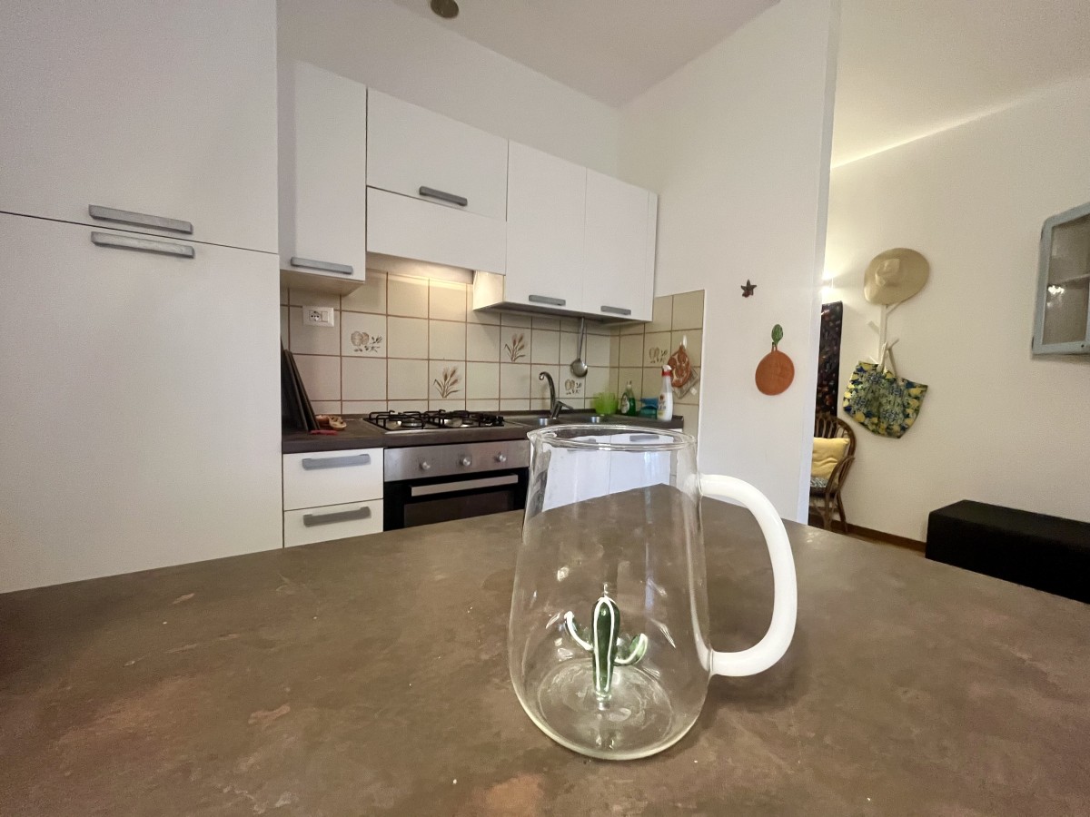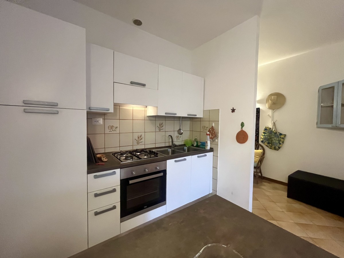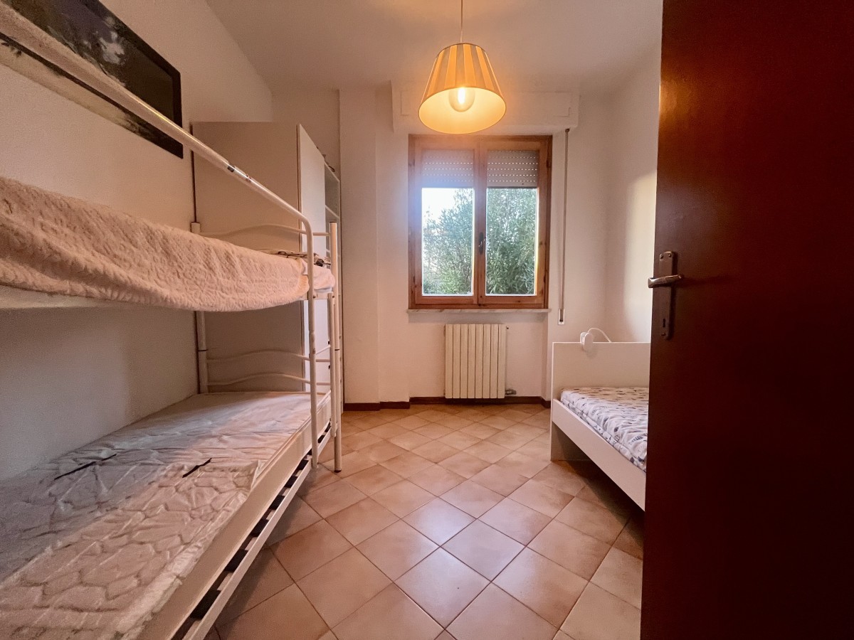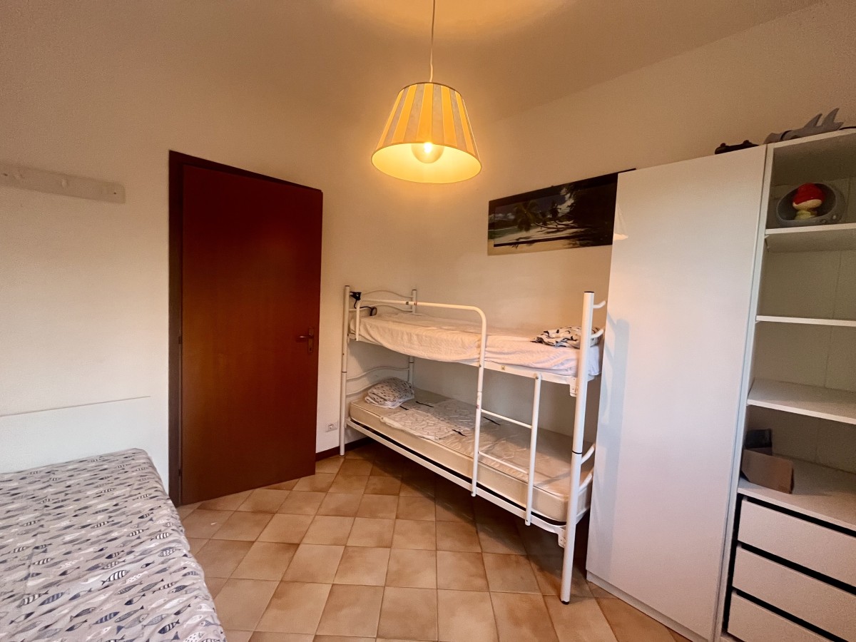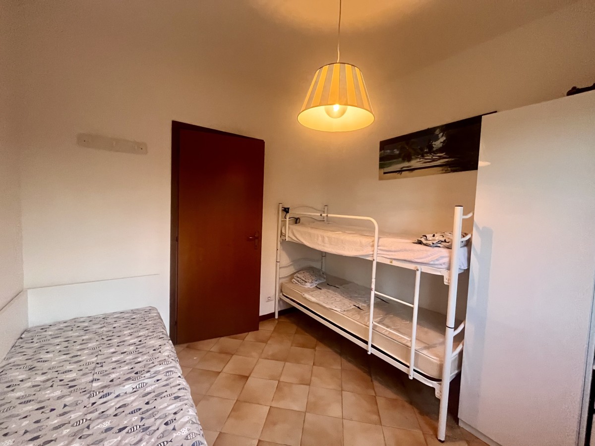 L'immobile si compone di ingresso in disimpegno, sala con angolo cottura, camera singola con tre letti, camera matrimoniale e bagno non finestrato dotato di box doccia. Accesso a terrazza attrezzata con tavolo e sedie e giardino di ampia metratura. Completa l'immobile posto auto non assegnato all'interno della proprietà.