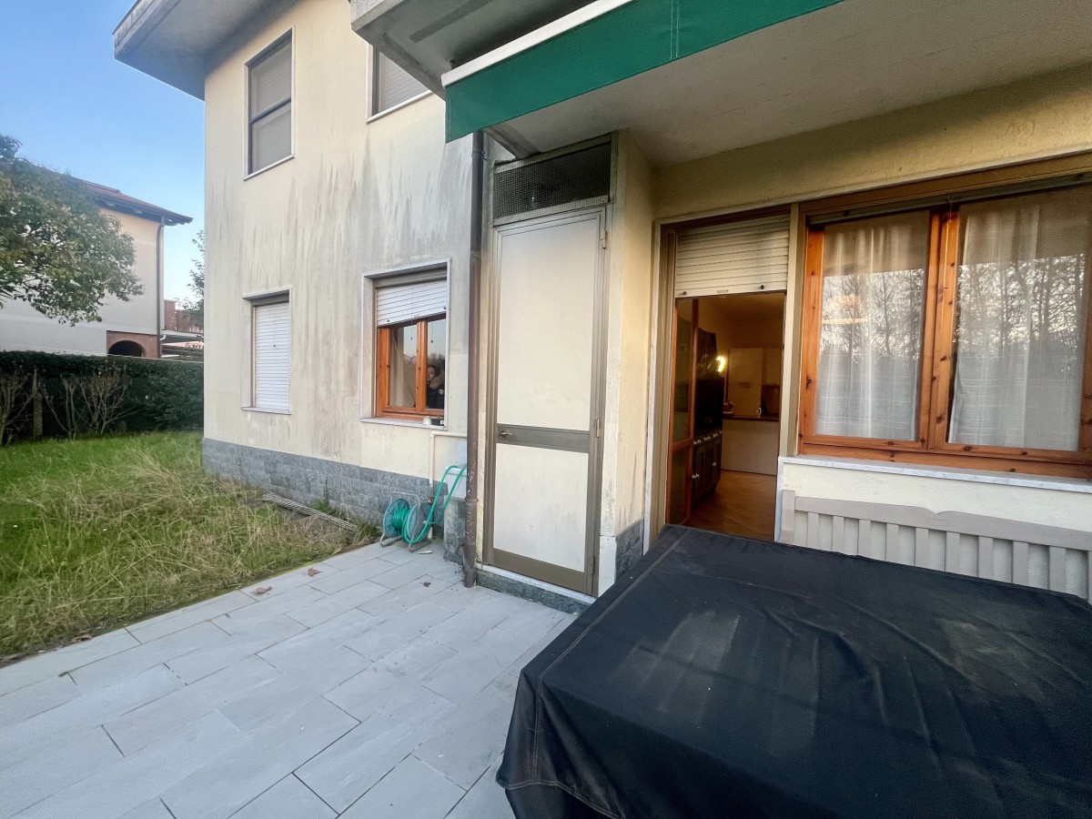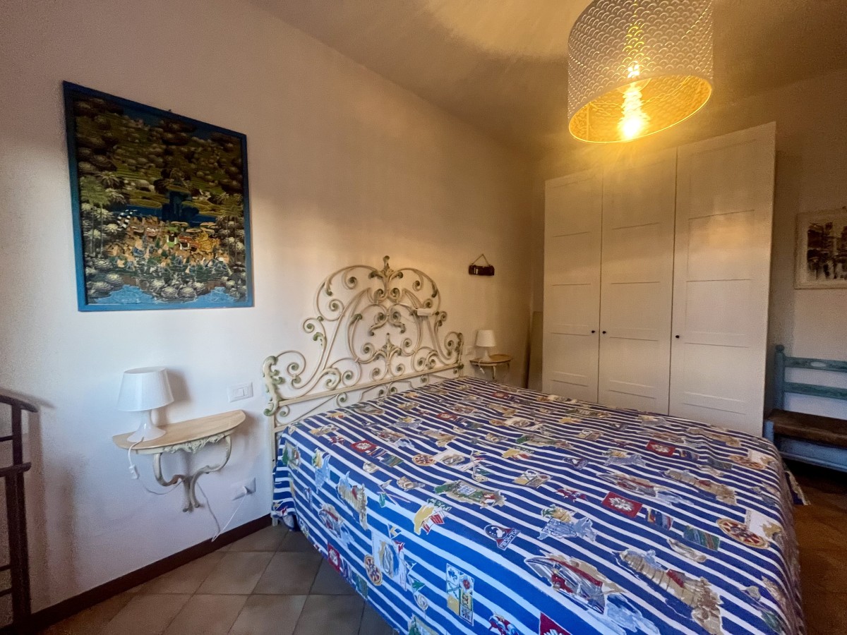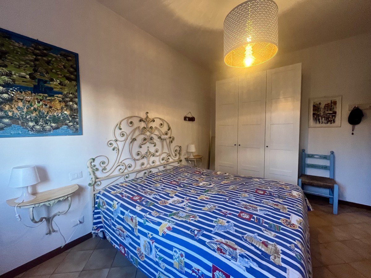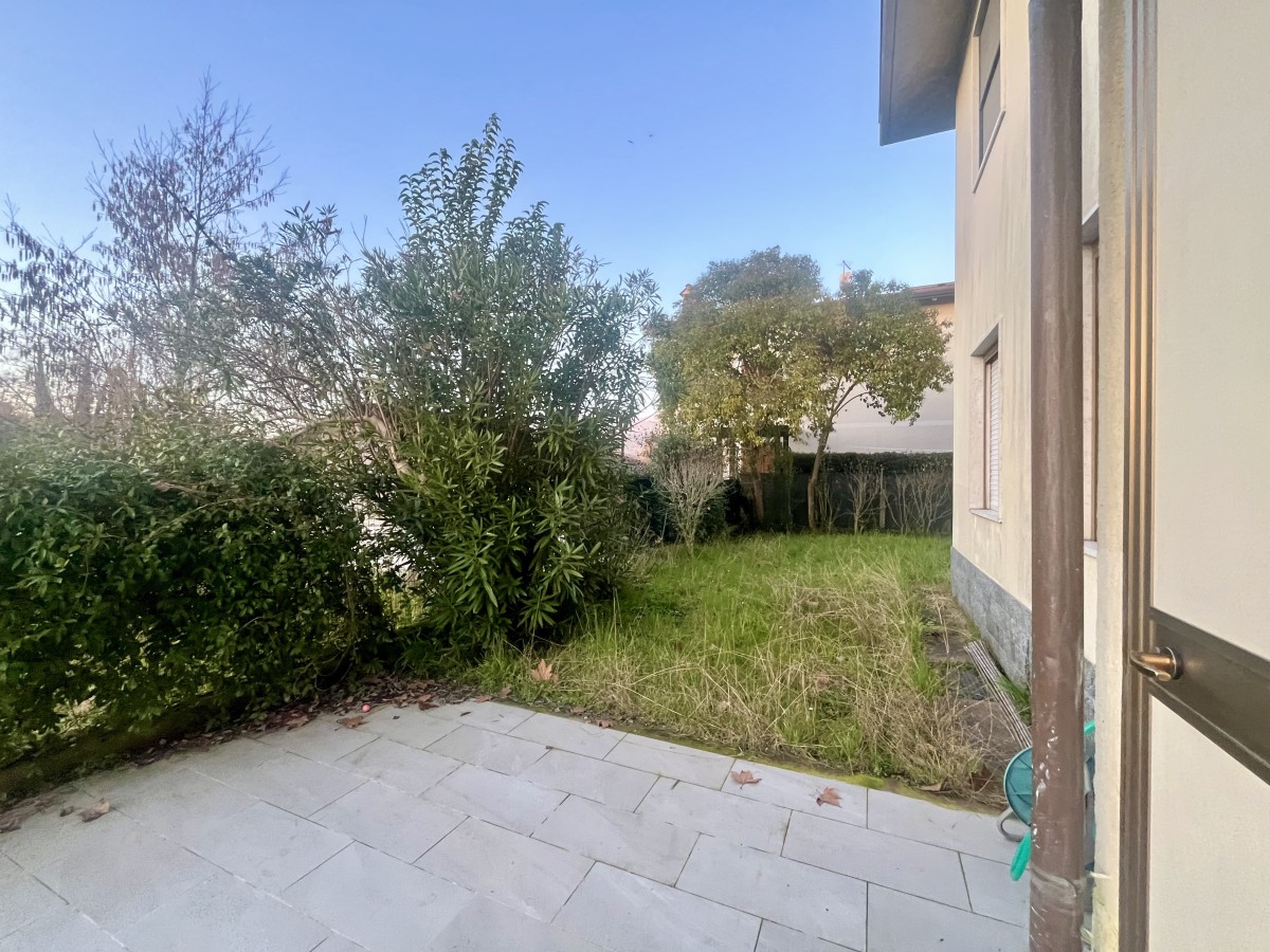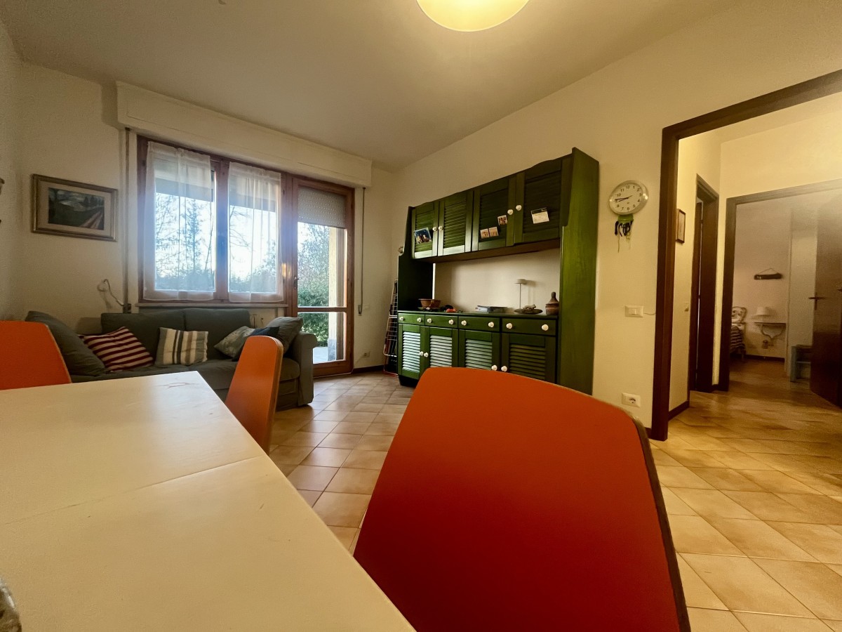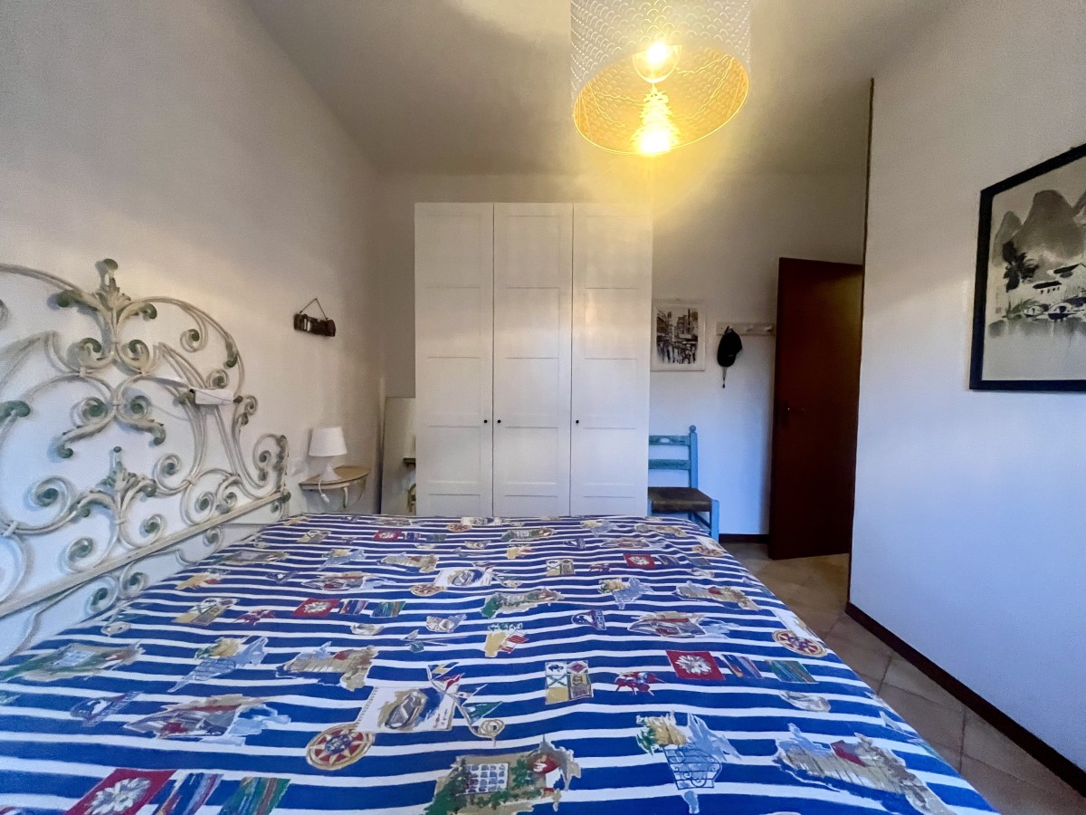 L'immobile si compone di ingresso in disimpegno, sala con angolo cottura, camera singola con tre letti, camera matrimoniale e bagno non finestrato dotato di box doccia. Accesso a terrazza attrezzata con tavolo e sedie e giardino di ampia metratura. Completa l'immobile posto auto non assegnato all'interno della proprietà.
